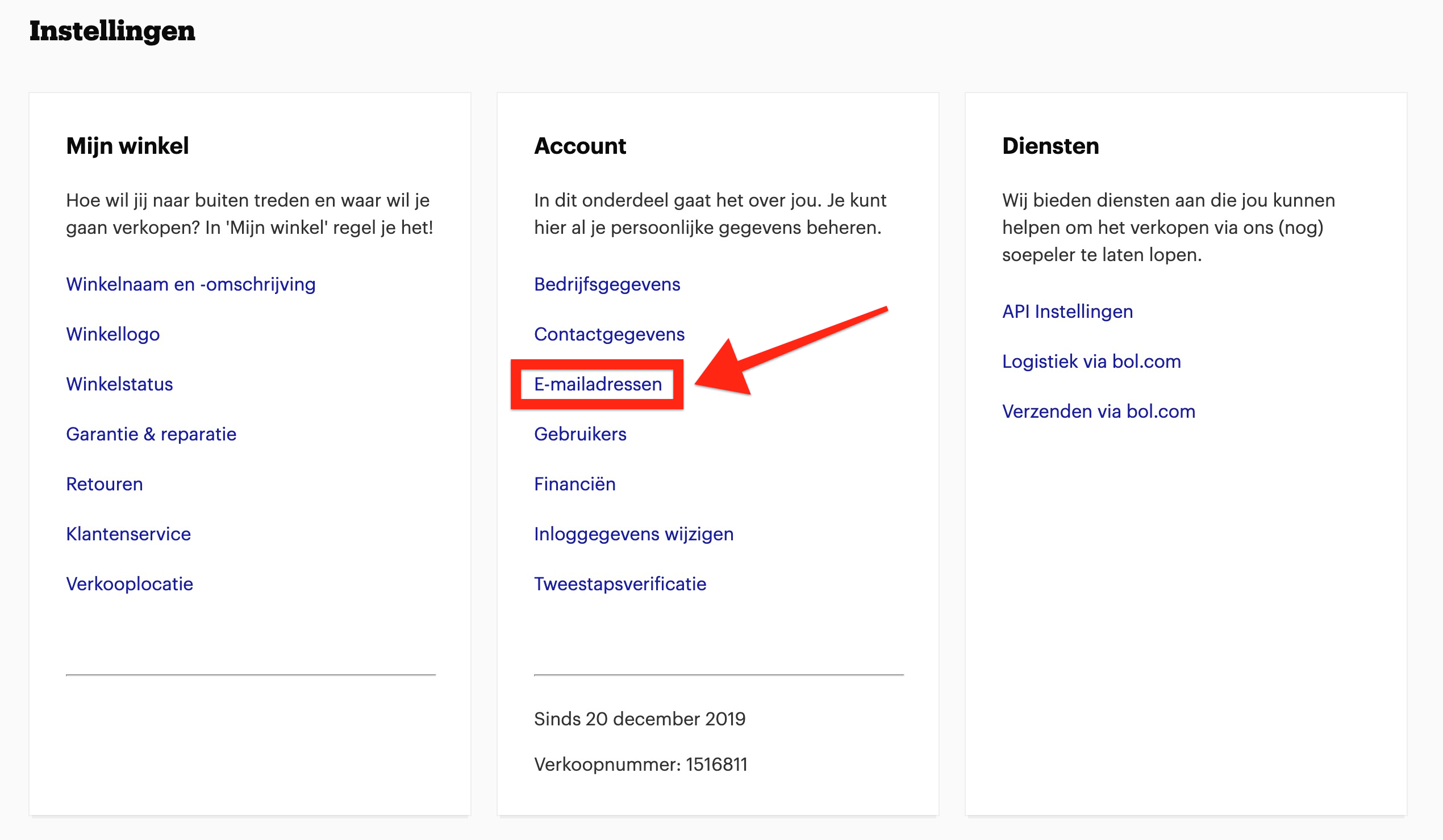 Go to "Instellingen" and go to "E-mailadressen" as shown below.