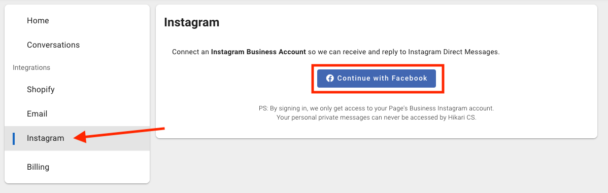 1: Go to your customer portal and go to the Instragram menu. Click Continue with Facebook.