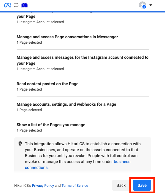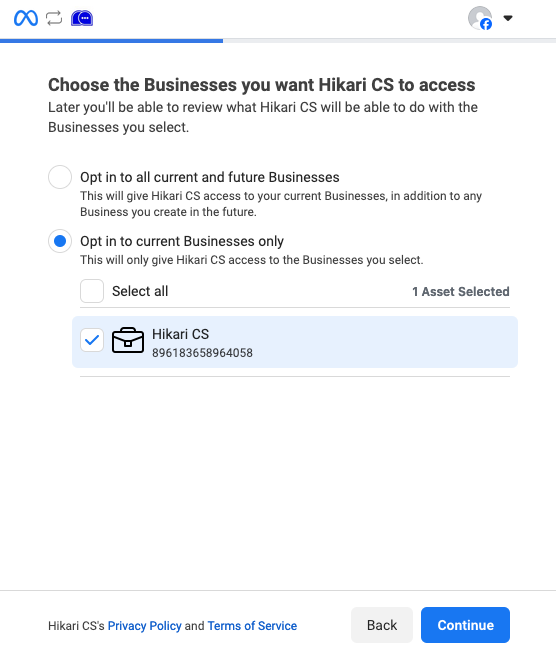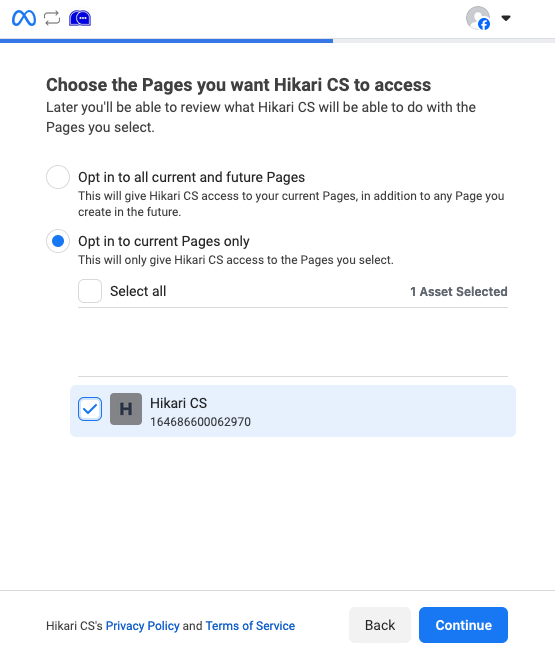 3: Choose the correct Facebook page and click continue.