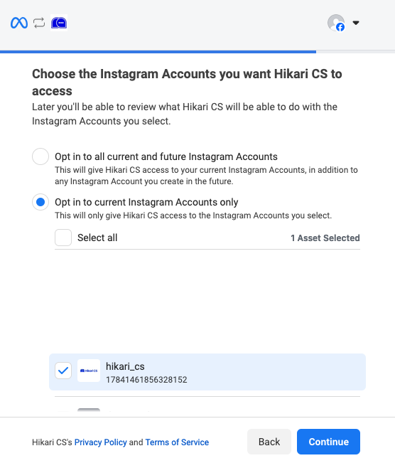 4: Choose the correct Instagram account and click continue.