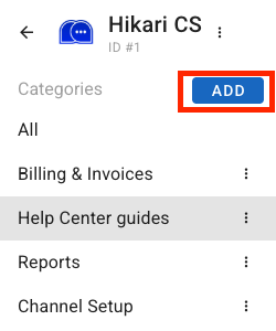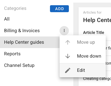 To create a category, simply navigate to the overview of your help articles and click the “Add” button at the top of your categories on the left side of the screen.