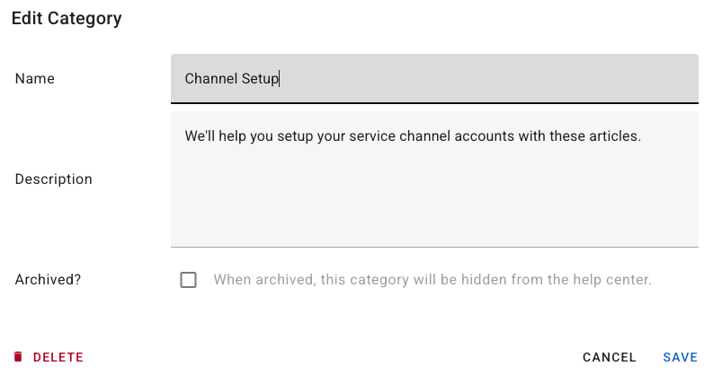 From the popup window, you can choose to edit the name and description, archive, or delete the category.