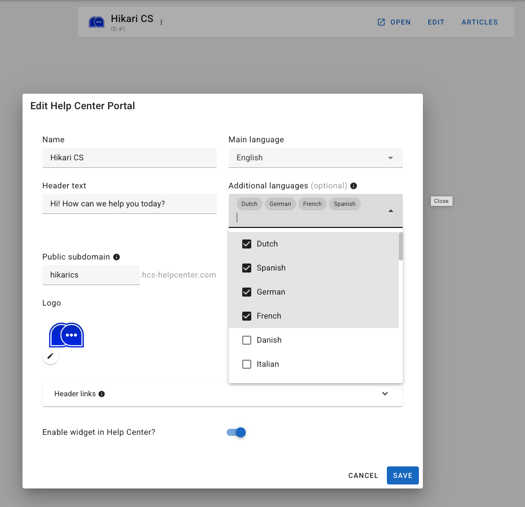 The help center is designed to easily support multiple languages, without needing manual translations. You can choose up to 4 languages to add from the settings menu, and your articles will be available in those languages. Together with the default language you’ll have a total of 5 supported languages.