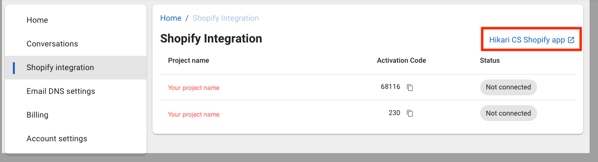 - Or get the activation code from your Hikari CS portal (under the Shopify integration menu) and paste it in the success page.